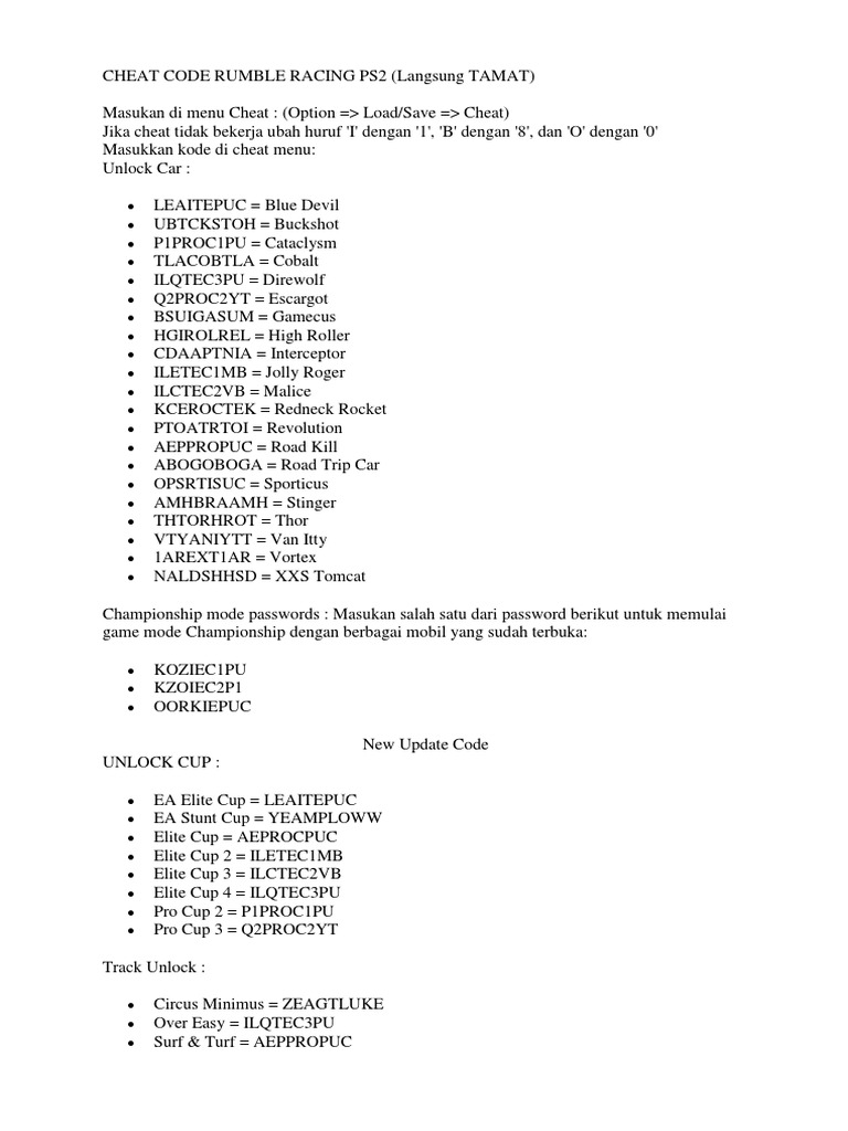 Cheat Password Lengkap Game Rumble Racing PS2 Password cheat rumble racing ps2 bahasa indonesia tc blog Password cheat rumble racing ps2 bahasa indonesia. Cheat Tamat GTA San Andreas. Cheat Rumble Racing Masukan di menu Cheat Option LoadSave Cheat Jika cheat tidak bekerja ubah huruf I dengan 1 B dengan 8 dan O dengan 0 Masukkan kode di cheat menu.