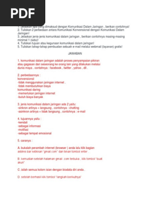 Komunikasi dalam jaringan adalah proses penyampaian pikiran atau gagasan dari seseorang ke orang lain yang dilakukan melalui dunia maya. SOAL SIMULASI DIGITAL KODE SOAL B A. Komunikasi dalam jaringan adalah cara berkomunikasi dimana penyampaian dan penerimaan informasi atau pesan dilakukan dengan menggunakan internet atau melalui dunia maya yang dapat dilakukan kapan saja dan dimana saja.